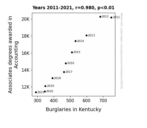 This means 96% of the change in the one variable (i.e., Burglaries in Kentucky) is predictable based on the change in the other (i.e., Associates degrees awarded in Accounting) over the 11 years from 2011 through 2021.