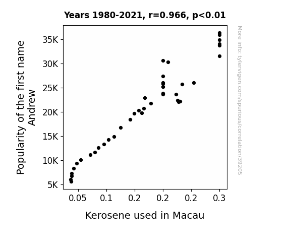 This means 93.3% of the change in the one variable (i.e., Kerosene used in Macau) is predictable based on the change in the other (i.e., Popularity of the first name Andrew) over the 42 years from 1980 through 2021.