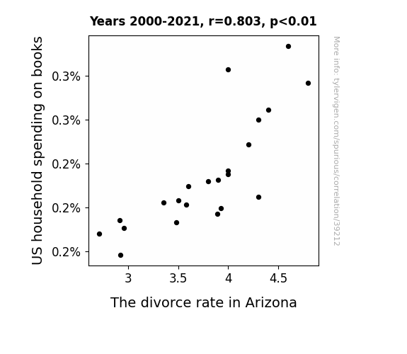 This means 64.5% of the change in the one variable (i.e., The divorce rate in Arizona) is predictable based on the change in the other (i.e., US household spending on books) over the 22 years from 2000 through 2021.