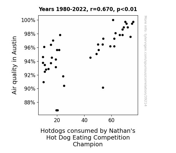 This means 44.8% of the change in the one variable (i.e., Hotdogs consumed by Nathan's Hot Dog Eating Competition Champion) is predictable based on the change in the other (i.e., Air quality in Austin) over the 43 years from 1980 through 2022.