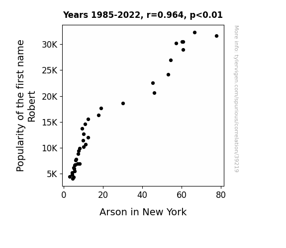 This means 92.9% of the change in the one variable (i.e., Arson in New York) is predictable based on the change in the other (i.e., Popularity of the first name Robert) over the 38 years from 1985 through 2022.