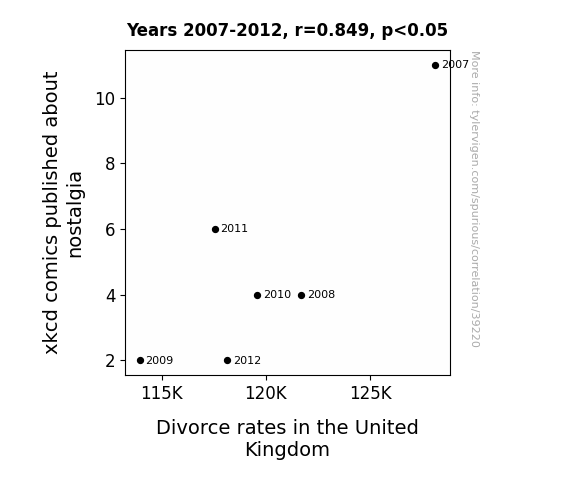 This means 72% of the change in the one variable (i.e., Divorce rates in the United Kingdom) is predictable based on the change in the other (i.e., xkcd comics published about nostalgia) over the 6 years from 2007 through 2012.