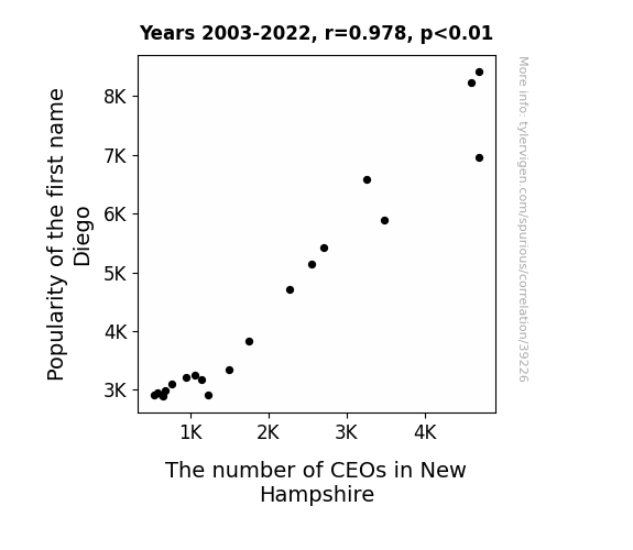 This means 95.7% of the change in the one variable (i.e., The number of CEOs in New Hampshire) is predictable based on the change in the other (i.e., Popularity of the first name Diego) over the 20 years from 2003 through 2022.