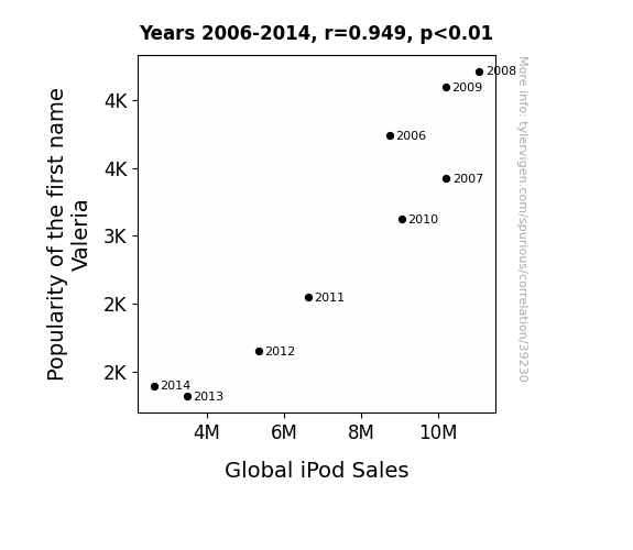 This means 90% of the change in the one variable (i.e., Global iPod Sales) is predictable based on the change in the other (i.e., Popularity of the first name Valeria) over the 9 years from 2006 through 2014.