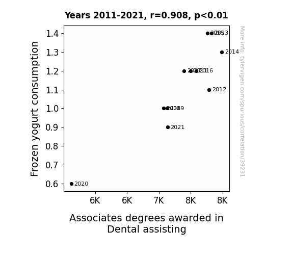 This means 82.5% of the change in the one variable (i.e., Associates degrees awarded in Dental assisting) is predictable based on the change in the other (i.e., Frozen yogurt consumption) over the 11 years from 2011 through 2021.