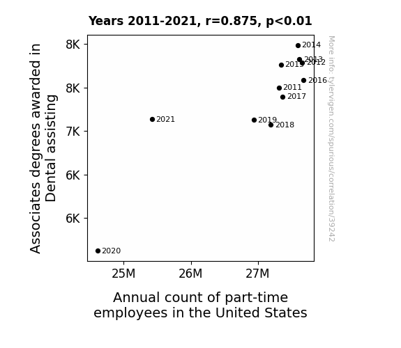 This means 76.5% of the change in the one variable (i.e., Annual count of part-time employees in the United States) is predictable based on the change in the other (i.e., Associates degrees awarded in Dental assisting) over the 11 years from 2011 through 2021.