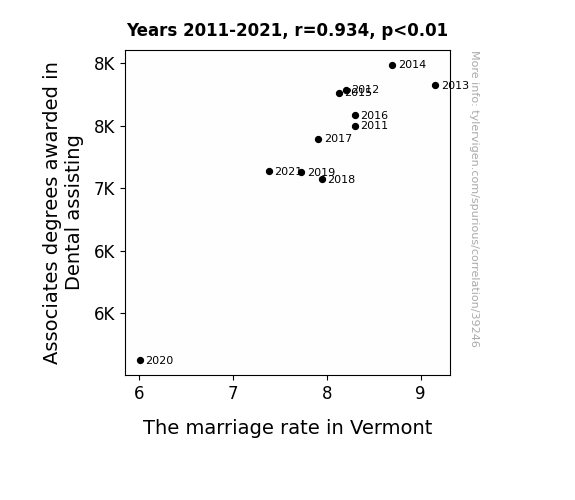 This means 87.2% of the change in the one variable (i.e., The marriage rate in Vermont) is predictable based on the change in the other (i.e., Associates degrees awarded in Dental assisting) over the 11 years from 2011 through 2021.