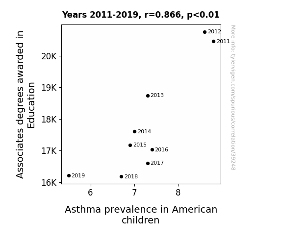 This means 75% of the change in the one variable (i.e., Asthma prevalence in American children) is predictable based on the change in the other (i.e., Associates degrees awarded in Education) over the 9 years from 2011 through 2019.