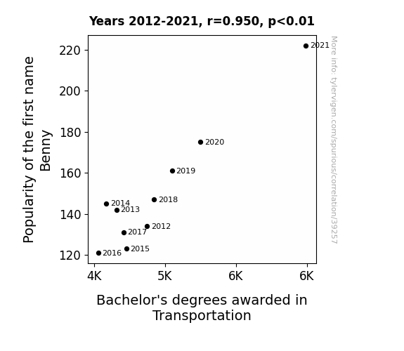 This means 90.2% of the change in the one variable (i.e., Bachelor's degrees awarded in Transportation) is predictable based on the change in the other (i.e., Popularity of the first name Benny) over the 10 years from 2012 through 2021.