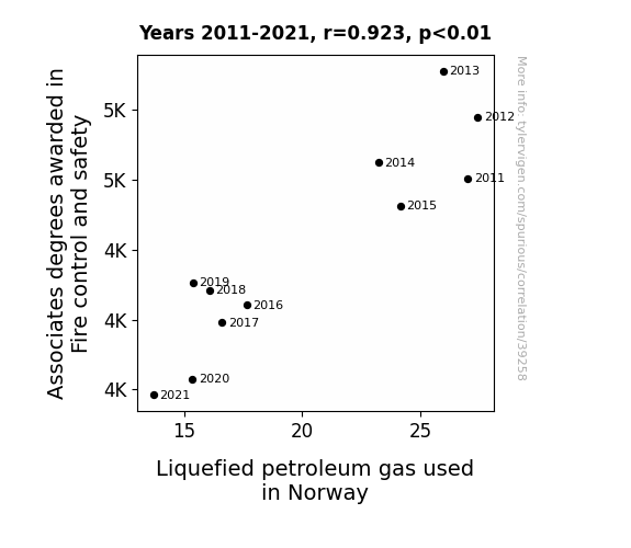 This means 85.2% of the change in the one variable (i.e., Liquefied petroleum gas used in Norway) is predictable based on the change in the other (i.e., Associates degrees awarded in Fire control and safety) over the 11 years from 2011 through 2021.
