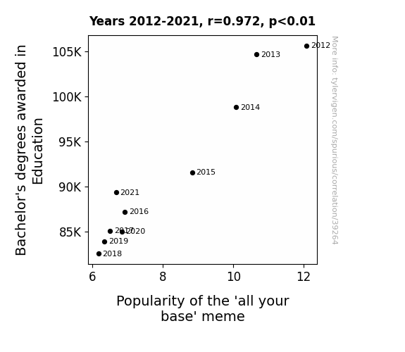 This means 94.5% of the change in the one variable (i.e., Popularity of the 'all your base' meme) is predictable based on the change in the other (i.e., Bachelor's degrees awarded in Education) over the 10 years from 2012 through 2021.