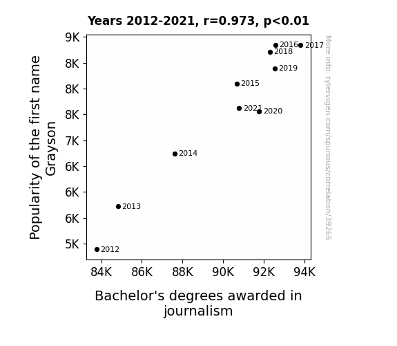 This means 94.7% of the change in the one variable (i.e., Bachelor's degrees awarded in journalism) is predictable based on the change in the other (i.e., Popularity of the first name Grayson) over the 10 years from 2012 through 2021.