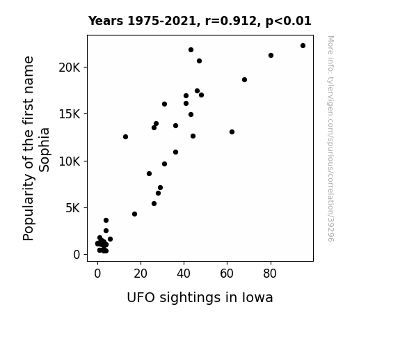 This means 83.2% of the change in the one variable (i.e., UFO sightings in Iowa) is predictable based on the change in the other (i.e., Popularity of the first name Sophia) over the 47 years from 1975 through 2021.