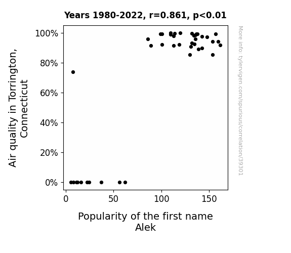 This means 74.1% of the change in the one variable (i.e., Popularity of the first name Alek) is predictable based on the change in the other (i.e., Air quality in Torrington, Connecticut) over the 43 years from 1980 through 2022.