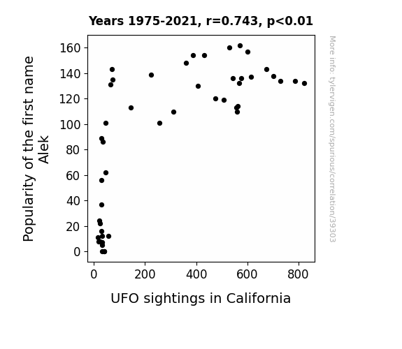 This means 55.2% of the change in the one variable (i.e., UFO sightings in California) is predictable based on the change in the other (i.e., Popularity of the first name Alek) over the 47 years from 1975 through 2021.