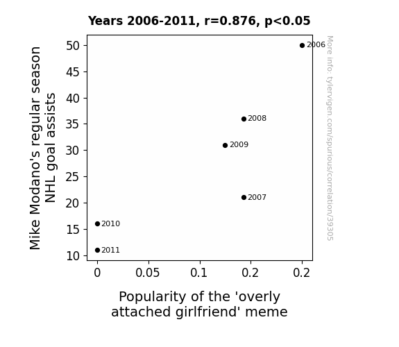 This means 76.7% of the change in the one variable (i.e., Popularity of the 'overly attached girlfriend' meme) is predictable based on the change in the other (i.e., Mike Modano's regular season NHL goal assists) over the 6 years from 2006 through 2011.
