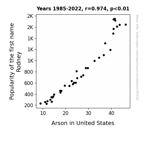 This means 94.8% of the change in the one variable (i.e., Arson in United States) is predictable based on the change in the other (i.e., Popularity of the first name Rodney) over the 38 years from 1985 through 2022.