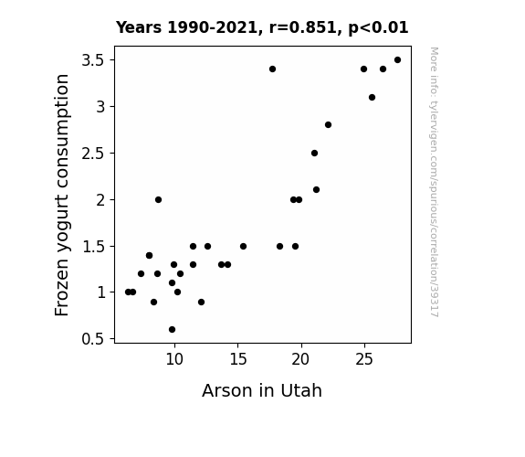 This means 72.4% of the change in the one variable (i.e., Arson in Utah) is predictable based on the change in the other (i.e., Frozen yogurt consumption) over the 32 years from 1990 through 2021.