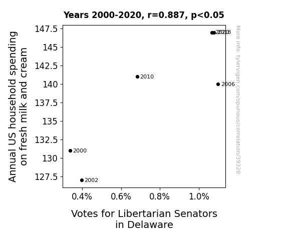 This means 78.7% of the change in the one variable (i.e., Votes for Libertarian Senators in Delaware) is predictable based on the change in the other (i.e., Annual US household spending on fresh milk and cream) over the 6 years from 2000 through 2020.