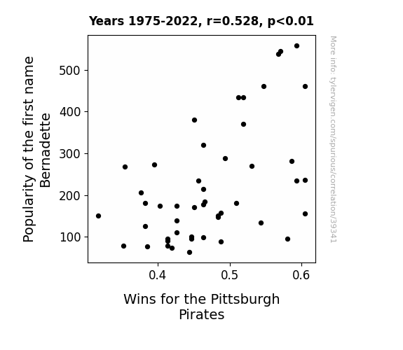 This means 27.9% of the change in the one variable (i.e., Wins for the Pittsburgh Pirates) is predictable based on the change in the other (i.e., Popularity of the first name Bernadette) over the 48 years from 1975 through 2022.