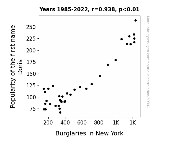 This means 88.1% of the change in the one variable (i.e., Burglaries in New York) is predictable based on the change in the other (i.e., Popularity of the first name Doris) over the 38 years from 1985 through 2022.
