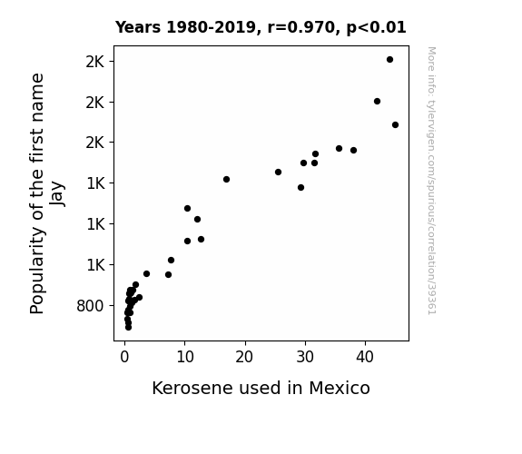 This means 94.1% of the change in the one variable (i.e., Kerosene used in Mexico) is predictable based on the change in the other (i.e., Popularity of the first name Jay) over the 40 years from 1980 through 2019.