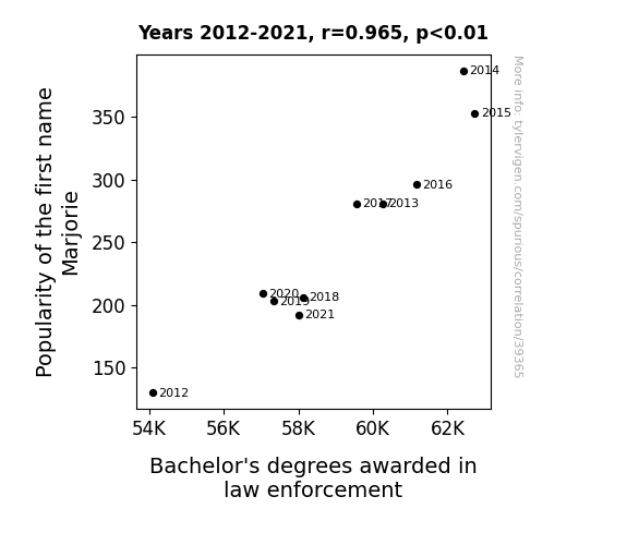 This means 93.1% of the change in the one variable (i.e., Bachelor's degrees awarded in law enforcement) is predictable based on the change in the other (i.e., Popularity of the first name Marjorie) over the 10 years from 2012 through 2021.