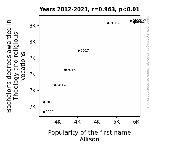 This means 92.7% of the change in the one variable (i.e., Popularity of the first name Allison) is predictable based on the change in the other (i.e., Bachelor's degrees awarded in Theology and religious vocations) over the 10 years from 2012 through 2021.