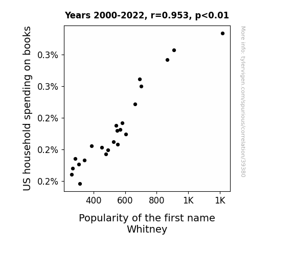 This means 90.9% of the change in the one variable (i.e., Popularity of the first name Whitney) is predictable based on the change in the other (i.e., US household spending on books) over the 23 years from 2000 through 2022.