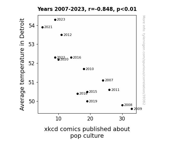 This means 71.9% of the change in the one variable (i.e., xkcd comics published about pop culture) is predictable based on the change in the other (i.e., Average temperature in Detroit) over the 14 years from 2007 through 2023.