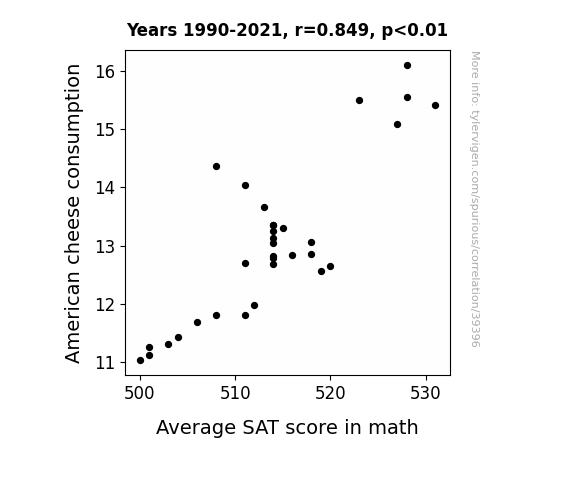 This means 72.1% of the change in the one variable (i.e., Average SAT score in math) is predictable based on the change in the other (i.e., American cheese consumption) over the 32 years from 1990 through 2021.