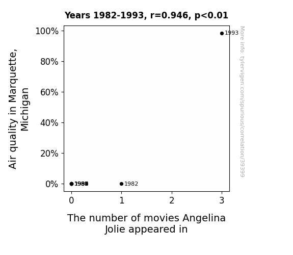 This means 89.5% of the change in the one variable (i.e., The number of movies Angelina Jolie appeared in) is predictable based on the change in the other (i.e., Air quality in Marquette, Michigan) over the 12 years from 1982 through 1993.