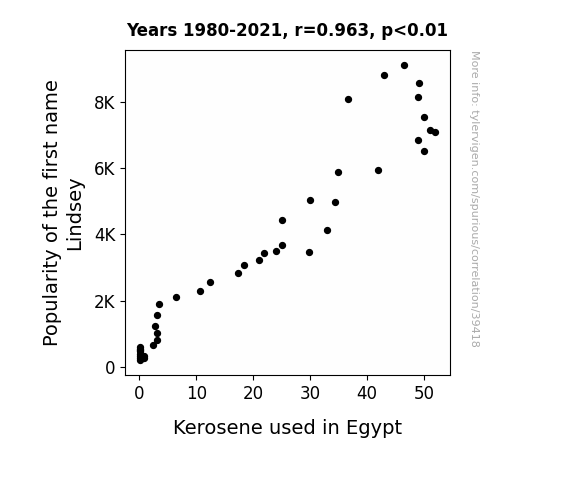 This means 92.8% of the change in the one variable (i.e., Kerosene used in Egypt) is predictable based on the change in the other (i.e., Popularity of the first name Lindsey) over the 42 years from 1980 through 2021.
