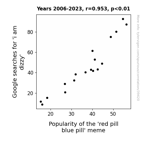 This means 90.8% of the change in the one variable (i.e., Popularity of the 'red pill blue pill' meme) is predictable based on the change in the other (i.e., Google searches for 'i am dizzy') over the 18 years from 2006 through 2023.