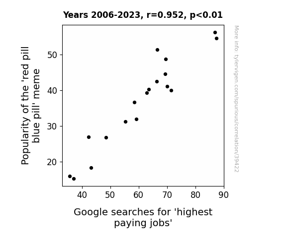 This means 90.7% of the change in the one variable (i.e., Google searches for 'highest paying jobs') is predictable based on the change in the other (i.e., Popularity of the 'red pill blue pill' meme) over the 18 years from 2006 through 2023.