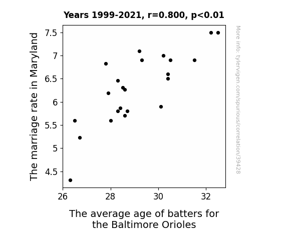 This means 64.1% of the change in the one variable (i.e., The average age of batters for the Baltimore Orioles) is predictable based on the change in the other (i.e., The marriage rate in Maryland) over the 23 years from 1999 through 2021.