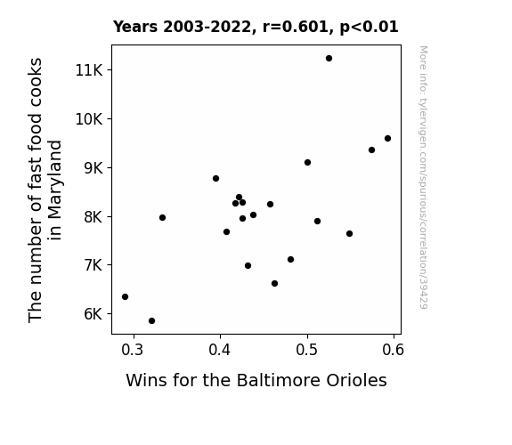 This means 36.1% of the change in the one variable (i.e., Wins for the Baltimore Orioles) is predictable based on the change in the other (i.e., The number of fast food cooks in Maryland) over the 20 years from 2003 through 2022.