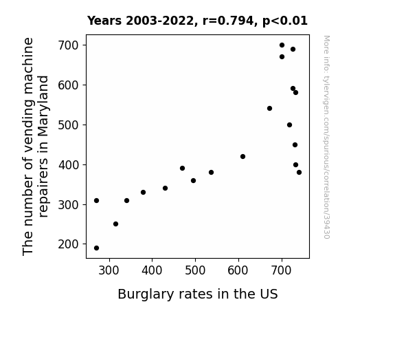 This means 63% of the change in the one variable (i.e., Burglary rates in the US) is predictable based on the change in the other (i.e., The number of vending machine repairers in Maryland) over the 20 years from 2003 through 2022.