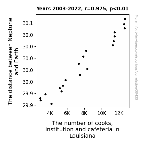 This means 95.2% of the change in the one variable (i.e., The number of cooks, institution and cafeteria in Louisiana) is predictable based on the change in the other (i.e., The distance between Neptune and Earth) over the 20 years from 2003 through 2022.
