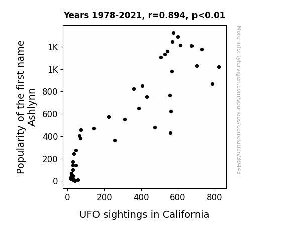 This means 80% of the change in the one variable (i.e., UFO sightings in California) is predictable based on the change in the other (i.e., Popularity of the first name Ashlynn) over the 44 years from 1978 through 2021.