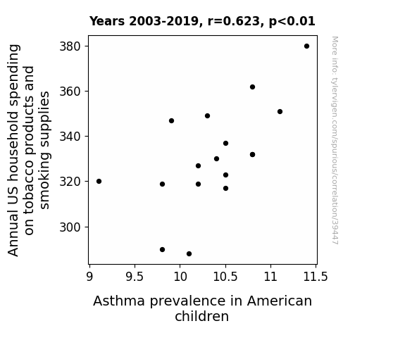 This means 38.9% of the change in the one variable (i.e., Asthma prevalence in American children) is predictable based on the change in the other (i.e., Annual US household spending on tobacco products and smoking supplies) over the 17 years from 2003 through 2019.