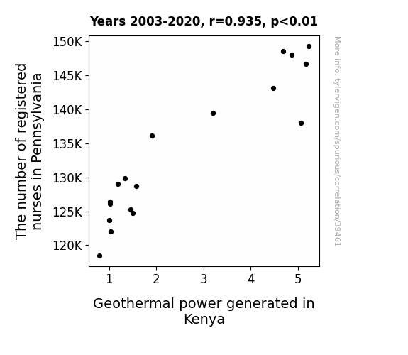 This means 87.5% of the change in the one variable (i.e., Geothermal power generated in Kenya) is predictable based on the change in the other (i.e., The number of registered nurses in Pennsylvania) over the 18 years from 2003 through 2020.