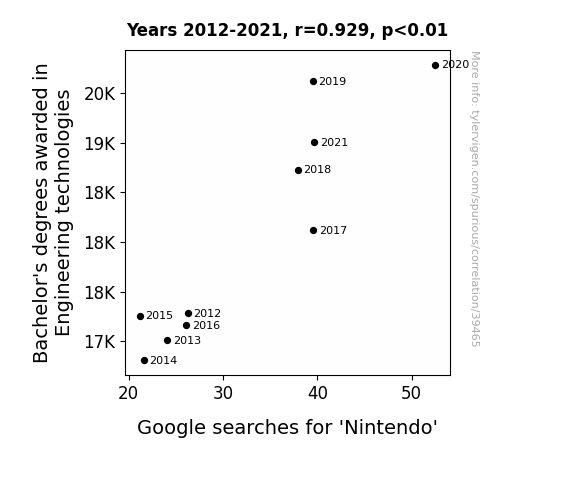 This means 86.4% of the change in the one variable (i.e., Google searches for 'Nintendo') is predictable based on the change in the other (i.e., Bachelor's degrees awarded in Engineering technologies) over the 10 years from 2012 through 2021.
