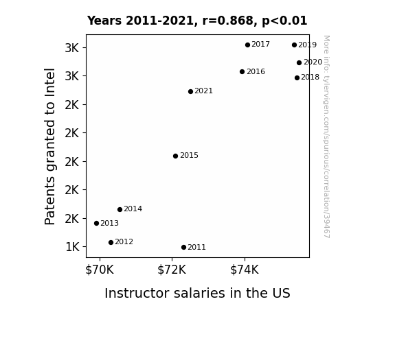 This means 75.4% of the change in the one variable (i.e., Instructor salaries in the US) is predictable based on the change in the other (i.e., Patents granted to Intel) over the 11 years from 2011 through 2021.
