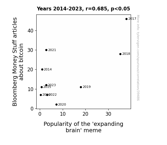 This means 46.9% of the change in the one variable (i.e., Popularity of the 'expanding brain' meme) is predictable based on the change in the other (i.e., Bloomberg Money Stuff articles about bitcoin) over the 10 years from 2014 through 2023.