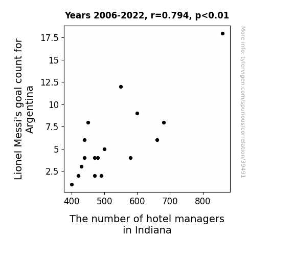 This means 63% of the change in the one variable (i.e., The number of hotel managers in Indiana) is predictable based on the change in the other (i.e., Lionel Messi's goal count for Argentina) over the 17 years from 2006 through 2022.