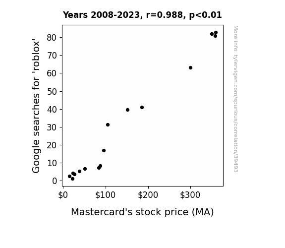 This means 97.6% of the change in the one variable (i.e., Mastercard's stock price (MA)) is predictable based on the change in the other (i.e., Google searches for 'roblox') over the 16 years from 2008 through 2023.