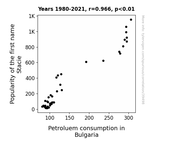 This means 93.4% of the change in the one variable (i.e., Petroluem consumption in Bulgaria) is predictable based on the change in the other (i.e., Popularity of the first name Stacie) over the 42 years from 1980 through 2021.