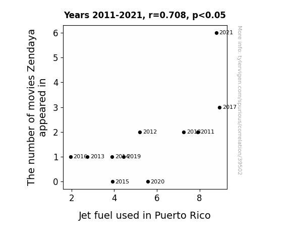 This means 50.1% of the change in the one variable (i.e., Jet fuel used in Puerto Rico) is predictable based on the change in the other (i.e., The number of movies Zendaya appeared in) over the 11 years from 2011 through 2021.