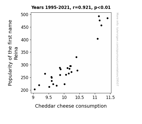 This means 84.8% of the change in the one variable (i.e., Cheddar cheese consumption) is predictable based on the change in the other (i.e., Popularity of the first name Reina) over the 27 years from 1995 through 2021.